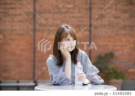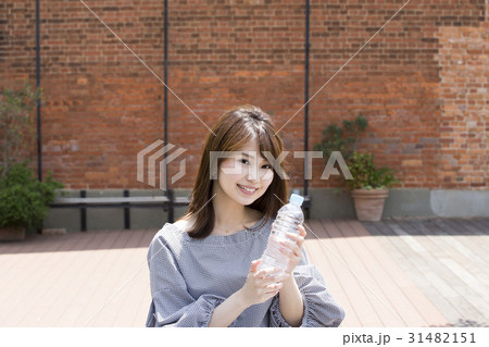 兵庫県神戸市のハーバーランドの神戸煉瓦倉庫の前で座りミネラルウォーターを手に持っている若い女性