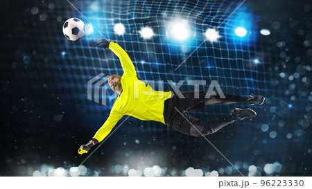 Soccer goalkeeper, in fluorescent uniform, that makes a great save and avoids a goal on a dark blue background