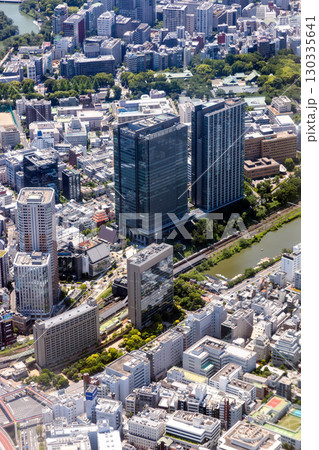 日本の東京都市景観 飯田橋駅周辺の街や神楽坂などを望む。手前は千鳥ヶ淵、三番町住宅なども見える