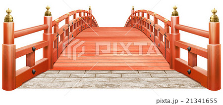 横 日本式 橋 川面 木製 朱塗り 白背景 CG