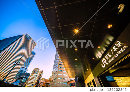 日本の東京都市景観 新御茶ノ水駅や御茶ノ水ソラシティ、ワテラスなどを望む。新時代に希望の光=10日