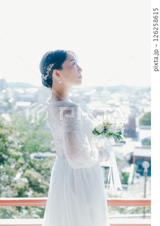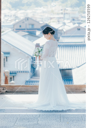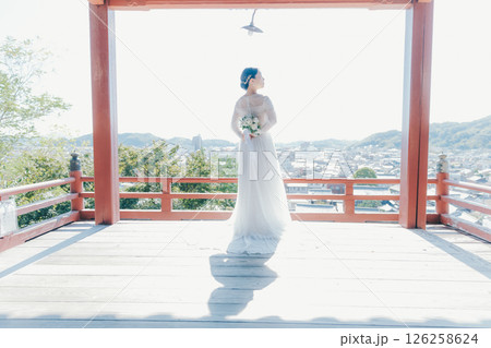 高台の神社から町並みを望むウェディングドレス姿の女性のポートレート