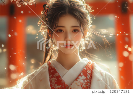白い着物と赤い袴の巫女:鳥居と朝陽が彩る日本の神秘的な瞬間