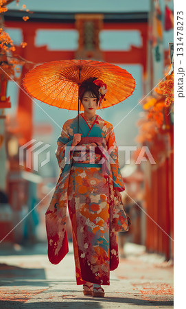 神社にいる着物姿の女性 AI生成画像