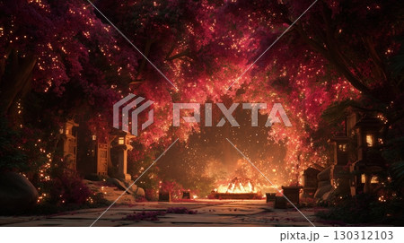 炎の神楽が舞う夏祭りの幻想的な神社風景