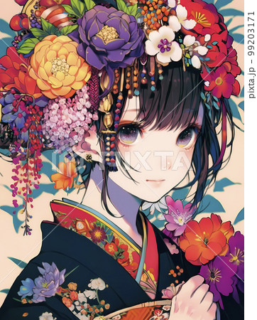 鮮やかな花に包まれた着物が似合うミステリアスな女性「AI生成画像」