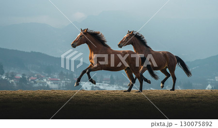 山を背に走る二頭の馬