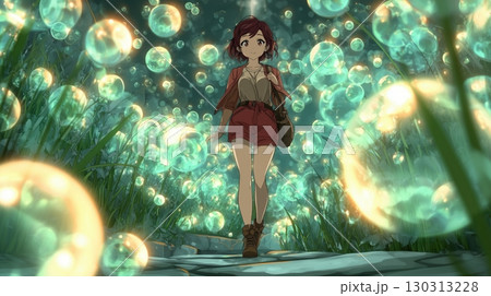 光る泡の庭を歩くアニメ少女の幻想旅