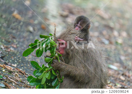 屋久島世界自然遺産の猿(7月)授乳中のヤクザルの親子