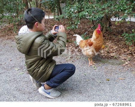 熱田神宮の参道のニワトリを撮影する小学生の男の子