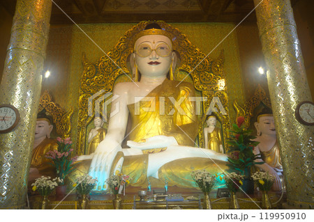 Shwe Myethman Buddha wears glasses. At Shwe Myethman Temple, Located at Shwedaung city in Myanmar.