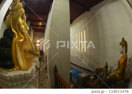 Golden Reclining Buddha in Sermon Hall ( Vihara ) at Wat Thammickarat. It is 12 meters long and faces north. His feet are covered with gold and decorated with glass. At Ayutthaya Historical Park.