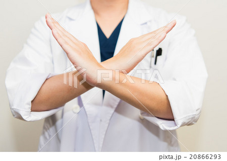 バツを手でサインする看護師 背景あり 白衣バージョン