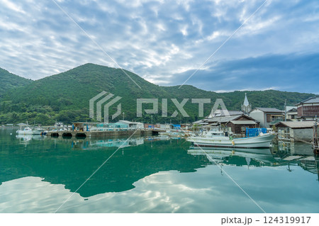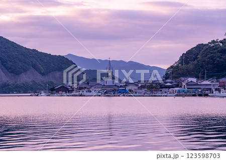 熊本県天草市 世界文化遺産に登録された天草の崎津カトリック教会の朝の海からの眺め