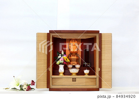 都市型仏壇に飾られた仏具と阿弥陀様の仏像1