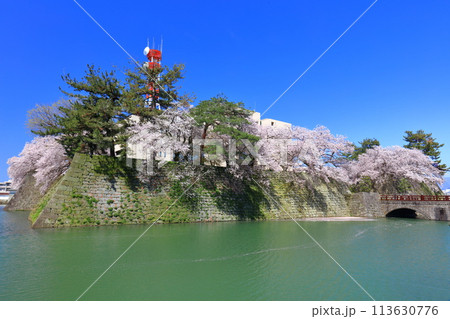 【福井県】快晴の福井城跡と満開の桜(御本城橋)