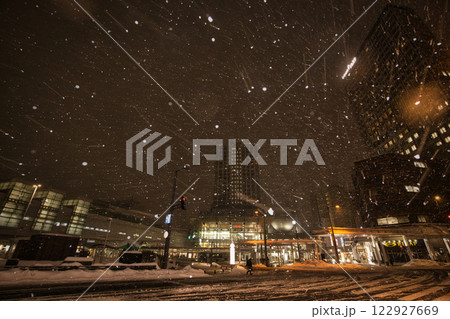吹雪の福井県庁お堀と福井駅の恐竜たち