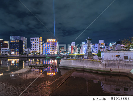 [九州・福岡] 中川と博多川の河口に立つ清流公園の高燈籠の夜景。