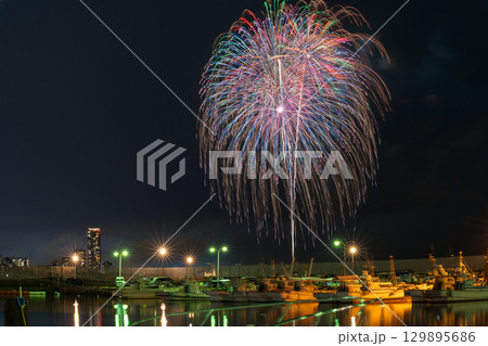 美しい夜空の都市景観に映える芸術花火大会風景 (福岡市西区のマリナタウン海浜公園)