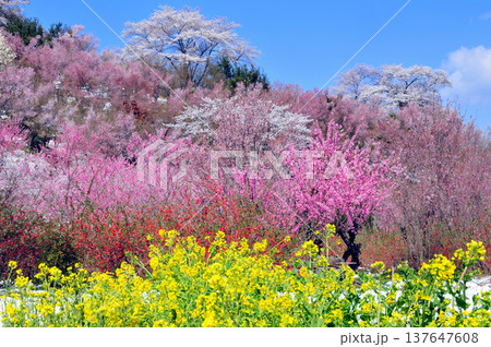 福島市花見山公園の花木と菜の花咲く里山