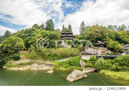 日本 福島県河沼郡柳津町にある福満虚空蔵菩薩、円蔵寺から見える只見川と柳津橋と紅葉