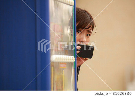 自動販売機の陰からスマートフォンで写真を撮る女性