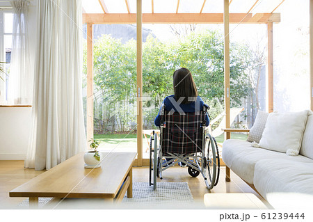 介護ベッドと電動車椅子のある部屋。窓から見える快晴
