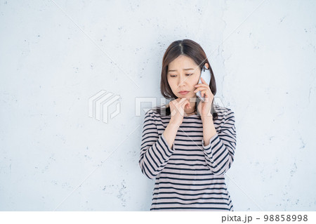 明るいリビングでスマートフォンで電話を掛ける困っている30代女性一人