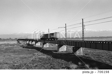 北アルプスを背景に常願寺川を渡る富山地方鉄道本線の普通列車