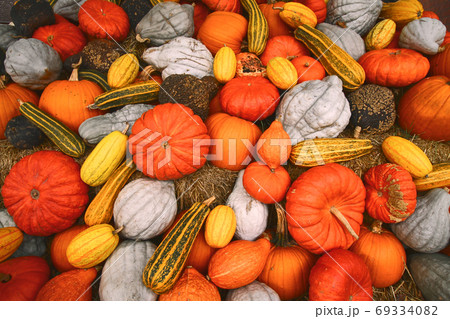 Many multicolor pumpkins, autumn seasonal decorative background