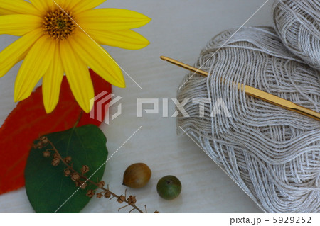 毛糸、かぎばりと秋冬の落葉や花で編み物のイメージ(白背景)
