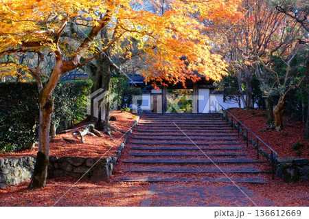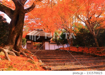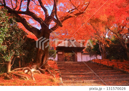 秋の京都 紅葉に包まれた安楽寺 山門