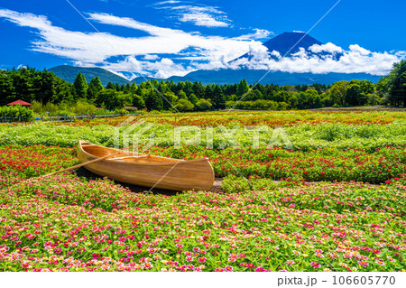 山梨県南都留郡山中湖村山中 青空の花の都公園のコスモス畑と百日草と後ろにそびえる富士山