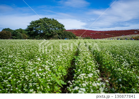 秋の国営ひたち海浜公園 赤く紅葉したコキアとそばの花 茨城県ひたちなか市