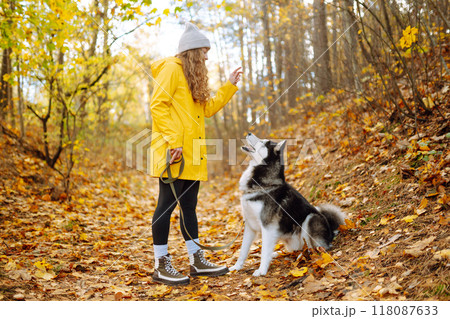 Beautiful young woman in a yellow coat walks in an autumn park with her pet husky.