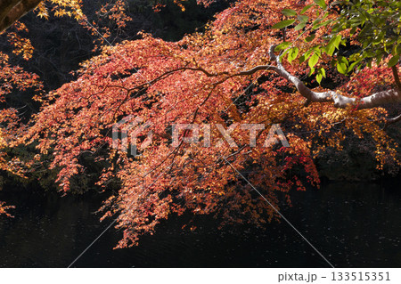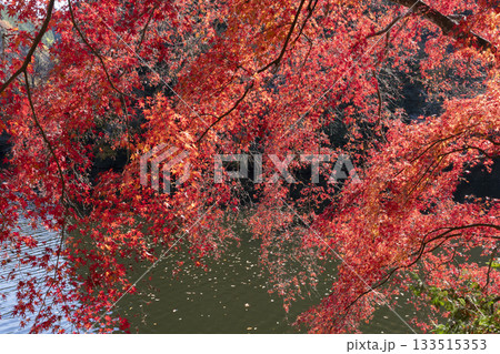 埼玉県入間郡毛呂山町宿谷 紅葉の名所である鎌北湖畔のもみじと湖面の水鏡