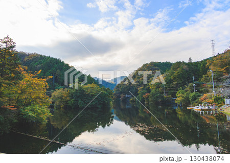 埼玉県入間郡毛呂山町宿谷 紅葉の名所である鎌北湖畔の紅葉と湖面の水鏡