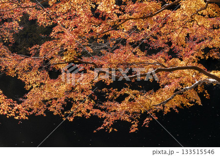 埼玉県入間郡毛呂山町宿谷 紅葉の名所である鎌北湖畔の逆光のもみじ