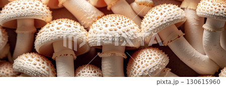 Fresh white mushrooms arranged in a flat lay composition, showcasing their unique textures and shapes, perfect for autumn culinary concepts with copy space
