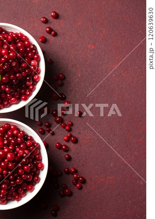 Two bowls of red lingonberries with scattered berries on a burgundy background. Top view