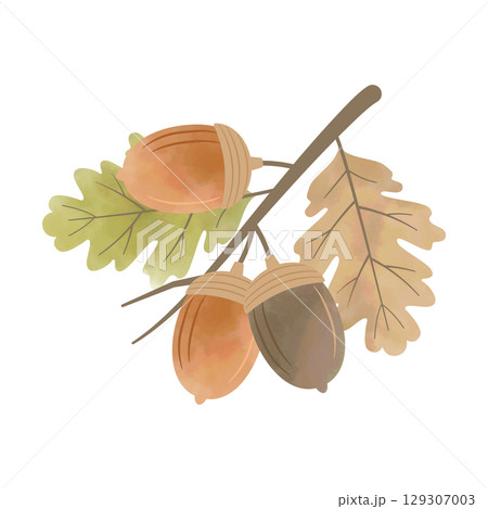 どんぐりと落ち葉の水彩パターン背景 秋の木の実と葉っぱのデザイン素材