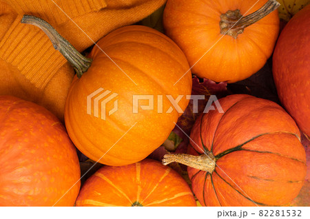 Autumn background. Pumpkins for decor and home decoration for Halloween and Thanksgiving. October, November, atmosphere and autumn mood concept.