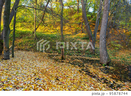 美麗公園裡,樹葉變黃,草地上遍地都是金黃的落葉。