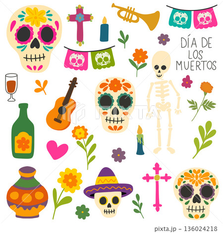Dia de los muertos celebrating with skulls, skeleton, and festive decorations