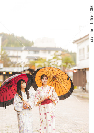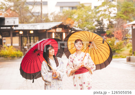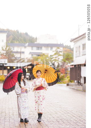 雨の中秋の温泉街を歩く浴衣姿の若い女性【撮影協力・新発田市フィルムコミッション協議会】