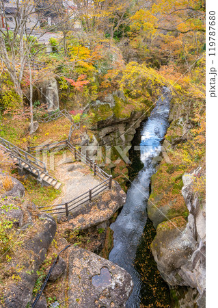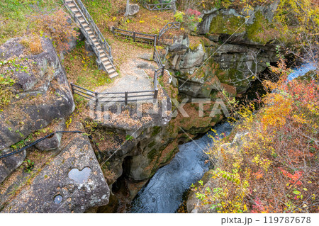秋保大滝の下流に位置する秋保温泉入り口の磊々峡らいらい峡。秋保石の大地を侵食した変化に富んだ風景