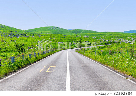 山口県美祢市 新緑が美しい快晴の秋吉台と秋吉台カルストロード