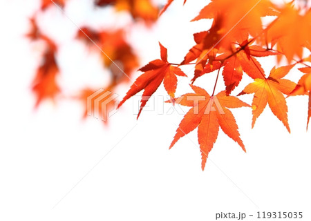 鮮やかに色づいたカエデの葉のクローズアップ 【白背景】 【空背景】
