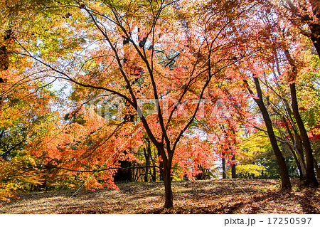 秋の公園 色づくカエデの葉 紅葉