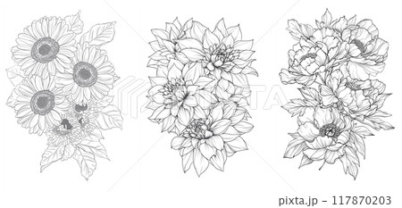 ガーベラ、ダリア、シャクヤクの美しい花の塗り絵。